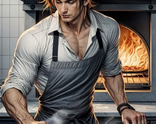 Prompt: Tall male character with a lean muscular physique, shoulder-length tied brown hair, dressed in a gray chef coat with rolled sleeves, a black apron, and dark pants, skillfully baking thin pizza dough in a classic oven. His focused expression conveys dedication and expertise. Include a detailed kitchen setting with flour dust in the air, wooden pizza peel, bubbling tomato sauce, vibrant toppings like bell peppers, mushrooms, and pepperoni. The scene should capture the essence of culinary artistry and precision. Vibrant colors for ingredients, realistic anime style, intricate line work, dynamic angles, dramatic lighting emphasizing the oven's warmth and the chef's concentration.