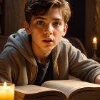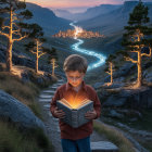 Prompt: A semi-truck is seen climbing up a winding hill just after dawn. The driver is faintly visible, and is very focused on the road, as it is not an easy route. He is the only vehicle on the road. In the distance, a town awakens.