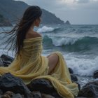 Prompt: Watercolor painting of a graceful young woman holding a delicate umbrella made of blooming flowers in the rain. Vibrant petals in shades of pink, yellow, and orange cascade like raindrops, creating a dreamy, poetic scene. The woman wears a simple black dress, her hair elegantly tied, with soft rain falling around her. Romantic atmosphere, delicate brush strokes, luminous colors, whimsical and enchanting, watercolor style, ethereal beauty.