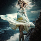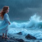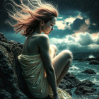 Her reflection, faint but luminous, is caught with delicate layers of glazing, as though two versions of her coexist — one real, one imagined. The glow of a streetlamp outside spills into the room, painting her hair in copper flames, alive and restless. She watches the rain fall, not in sadness, but with a stillness that feels like listening to the world breathe.