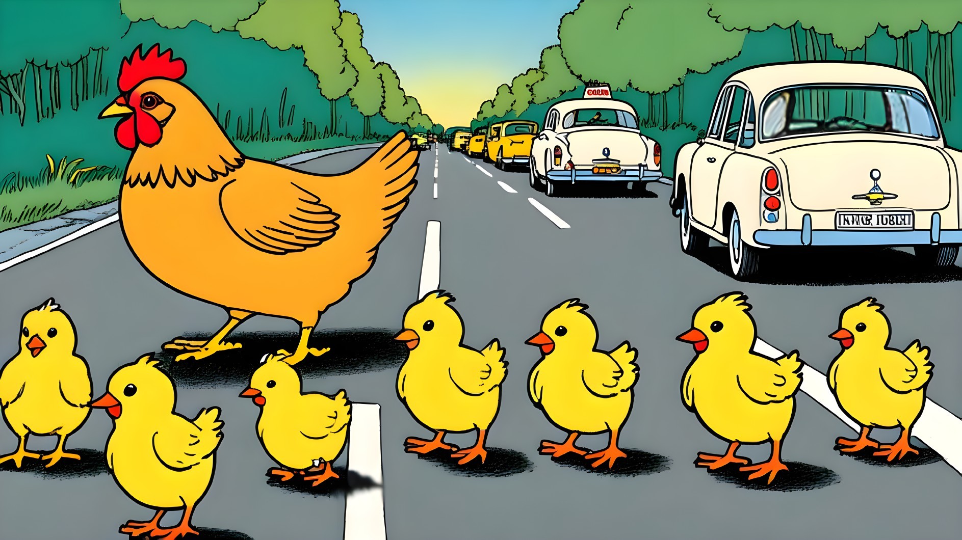 *The most beautiful autumn scene with a steep winding path paved with white pebbles that Has a 1968 Chevy Camaro on it and passes by the sea and by the trees that are richly decorated with green, red and yellow maple leaves. A flock of birds flying to the south. Windy weather, expansive view of the undulating sea, serene and picturesque.