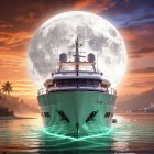 Prompt: Hyper-realistic vertical night seascape, 8k resolution, cinematic lighting. Foreground: tropical coastline with dark palm tree silhouettes and blooming purple bushes, illuminated by warm golden lanterns. Sea: vibrant emerald green water, crystal clear, with glowing bioluminescent turquoise cellular patterns visible on the shallow sandy bottom. A large, sleek luxury yacht with perfect white balance and warm interior lighting sails across the water. Background: a distant coastal city with illuminated skyscrapers and a glowing crescent beach. Far-off jagged mountains are rendered as dark, sharp, high-contrast silhouettes. Sky: clear, deep sapphire blue night sky filled with sharp, bright stars, no clouds or haze. A massive, oversized, highly detailed moon with visible craters and a soft cyan glow dominates the upper sky. High contrast, extreme detail, sharp focus.