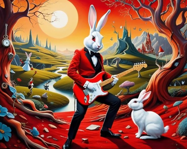 Prompt: Alice in Wonderland plays a red Fender Stratocaster while the White Rabbit watches in a surreal, vibrant landscape influenced by Salvador Dalí. Time is distorted, with melting guitars hanging from twisted trees. Alice should exhibit a tough attitude, dressed in a whimsical outfit, while the White Rabbit, wearing a dapper suit and holding a pocket watch, looks at her in shock. Use bold colors and peculiar visual elements to enhance the dreamlike quality, blending fantastical details with the essence of a bizarre, otherworldly atmosphere reminiscent of the Dada movement, featuring unexpected juxtapositions and playful absurdity.