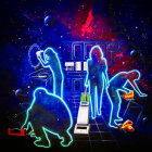 Jesus Standing holding a Crystal Ball with Jesus wearing the thorn crown inside it wearing a purple Robe of 2 Black Panther Spirit Guides