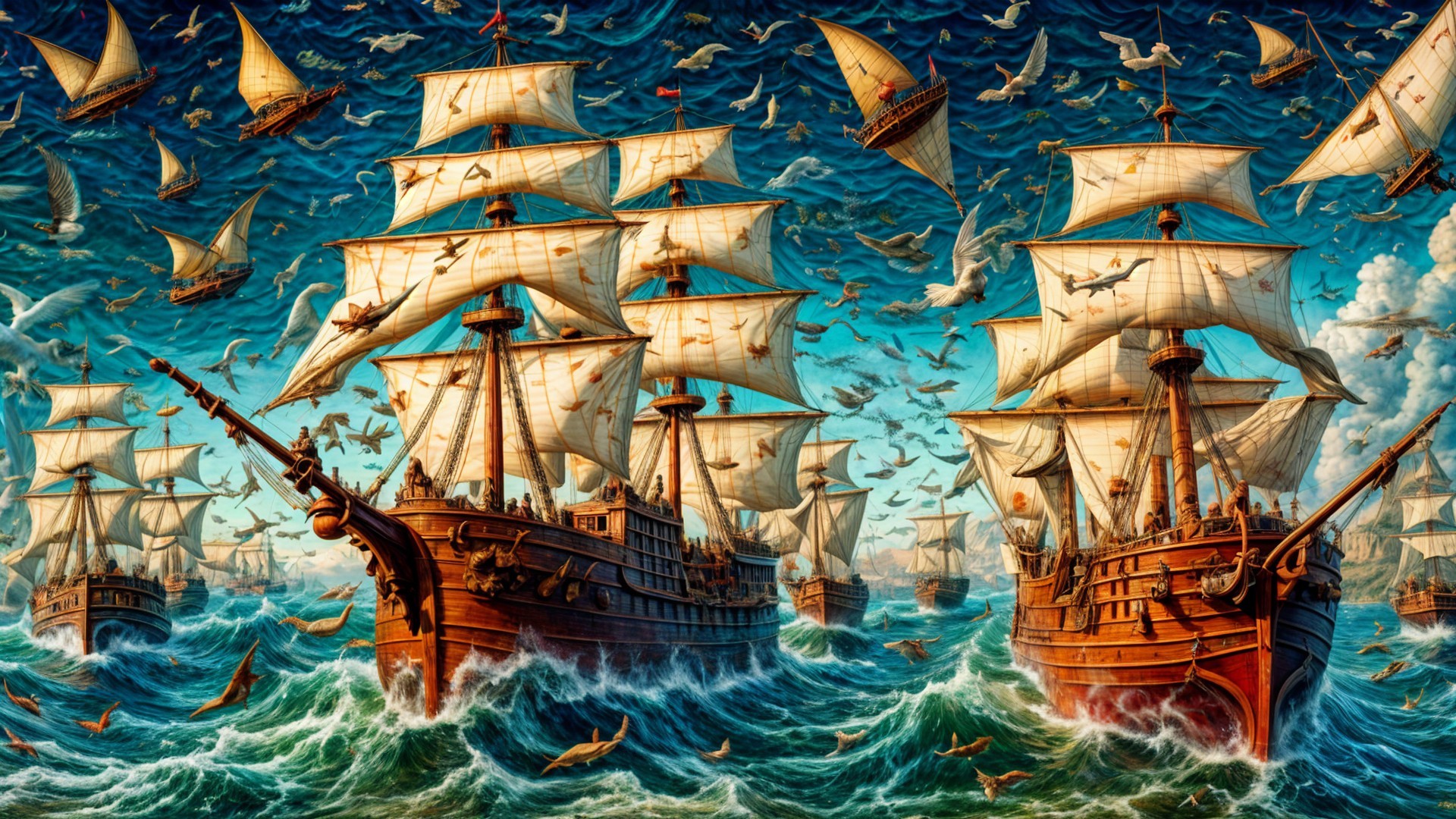 Whimsical Seascape with Tall Ships and Idyllic Islands