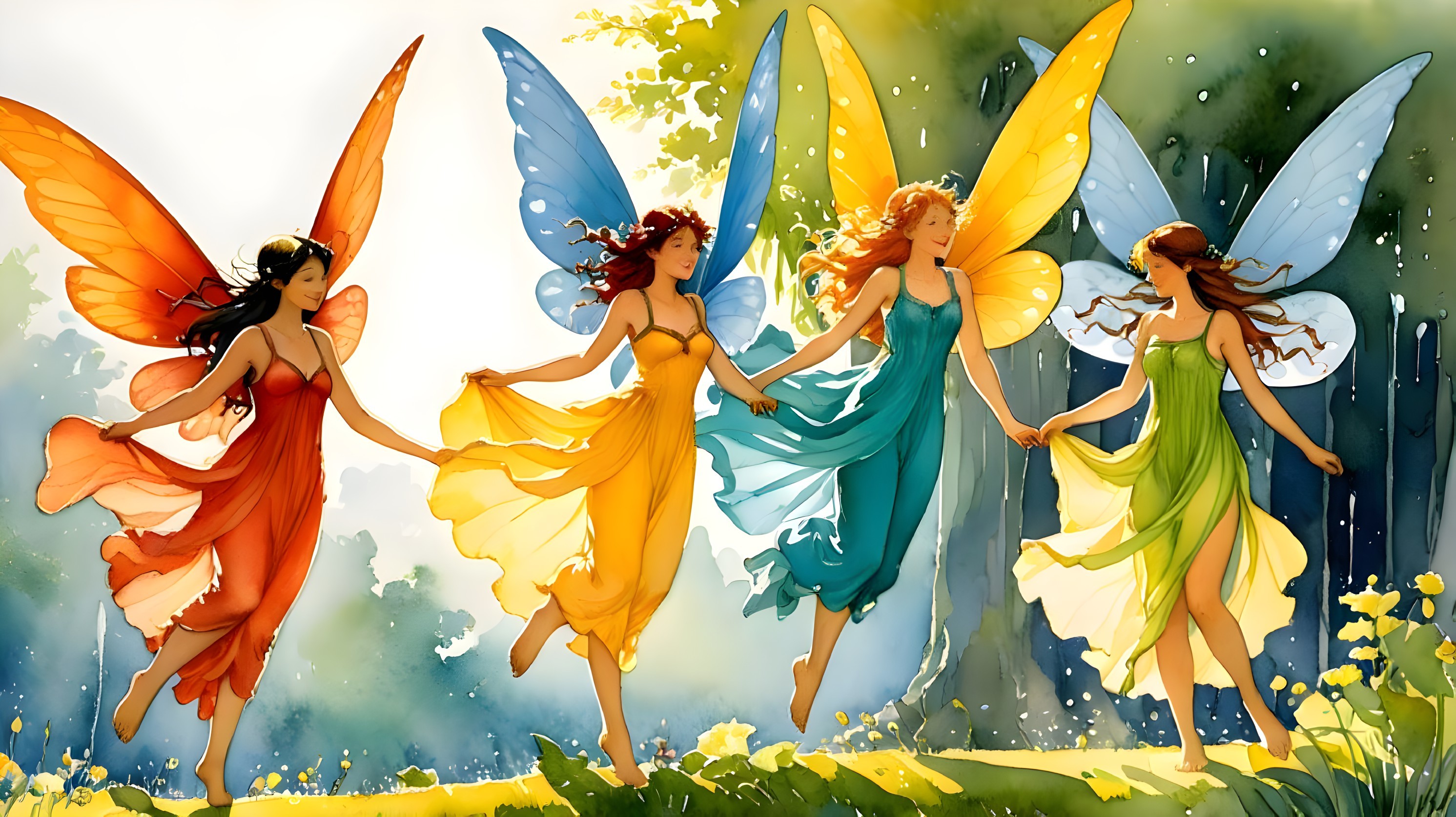 Warm vibrant colours dominated by hues of green, deep blue yellow and orange. sparkling light reflections from the sun on a hot summer day highlight the beautiful facial and bodily features of the two women..