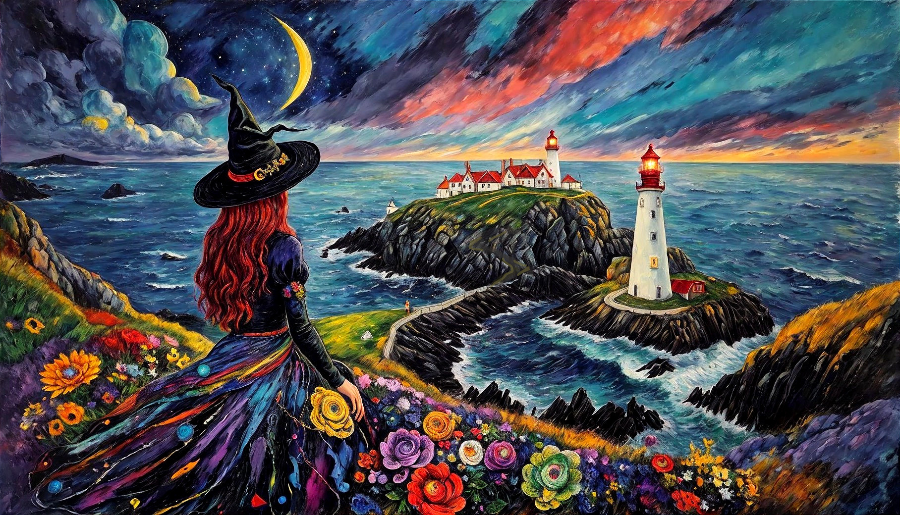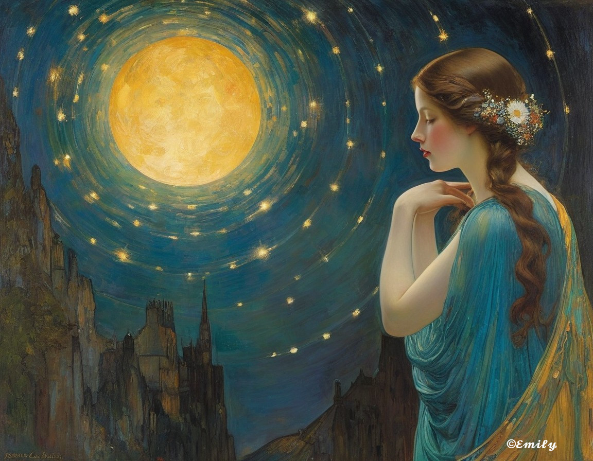 Serene Woman with Flowers Gazing at Full Moon