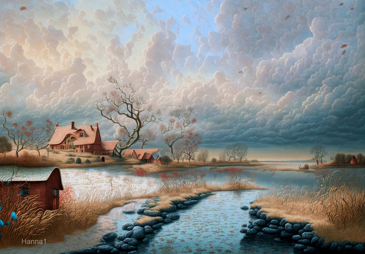 • Prompt: Aquarelle painting. Beautiful small gravel stream. Gorgeous foggy landscape with beautiful view, wonderful nature and adorable wild flowers. Yellow burning background. Red highly intricate sky. Gorgeous sunset. High contrast. Wet on wet watercolour. Late April. Dramatic atmosphere. Medieval style painting. By Jean Baptiste Monge