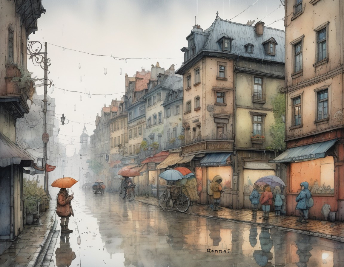 • Prompt: street with some people. Rain and fog. Rainy day. Jean-Baptiste Monge style, watercolor, ink. Picturesque and colorful.