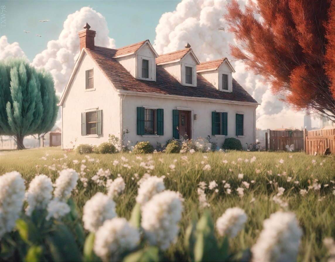 Charming White Cottage Surrounded by Lush Greenery 79w