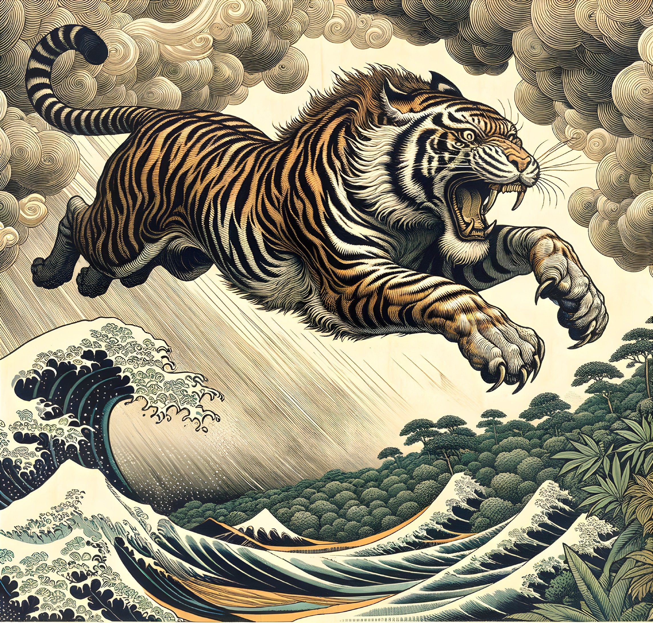 Tiger Leaping Over Waves in Traditional Asian Art