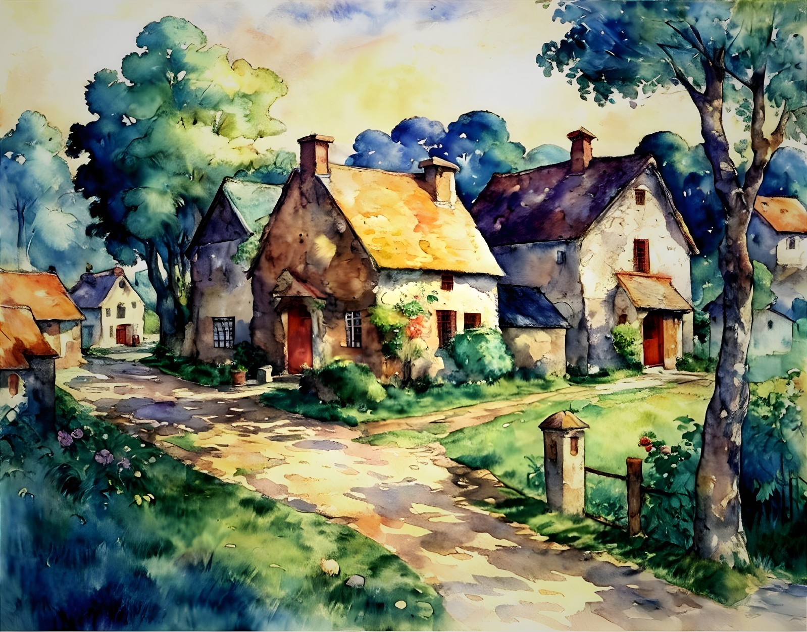 • Prompt: Rural village set in lush verdant surroundings. Watercolour wet in wet, expressionist painting style of Henri de Toulouse-Lautrec, Amadeo Modigliani