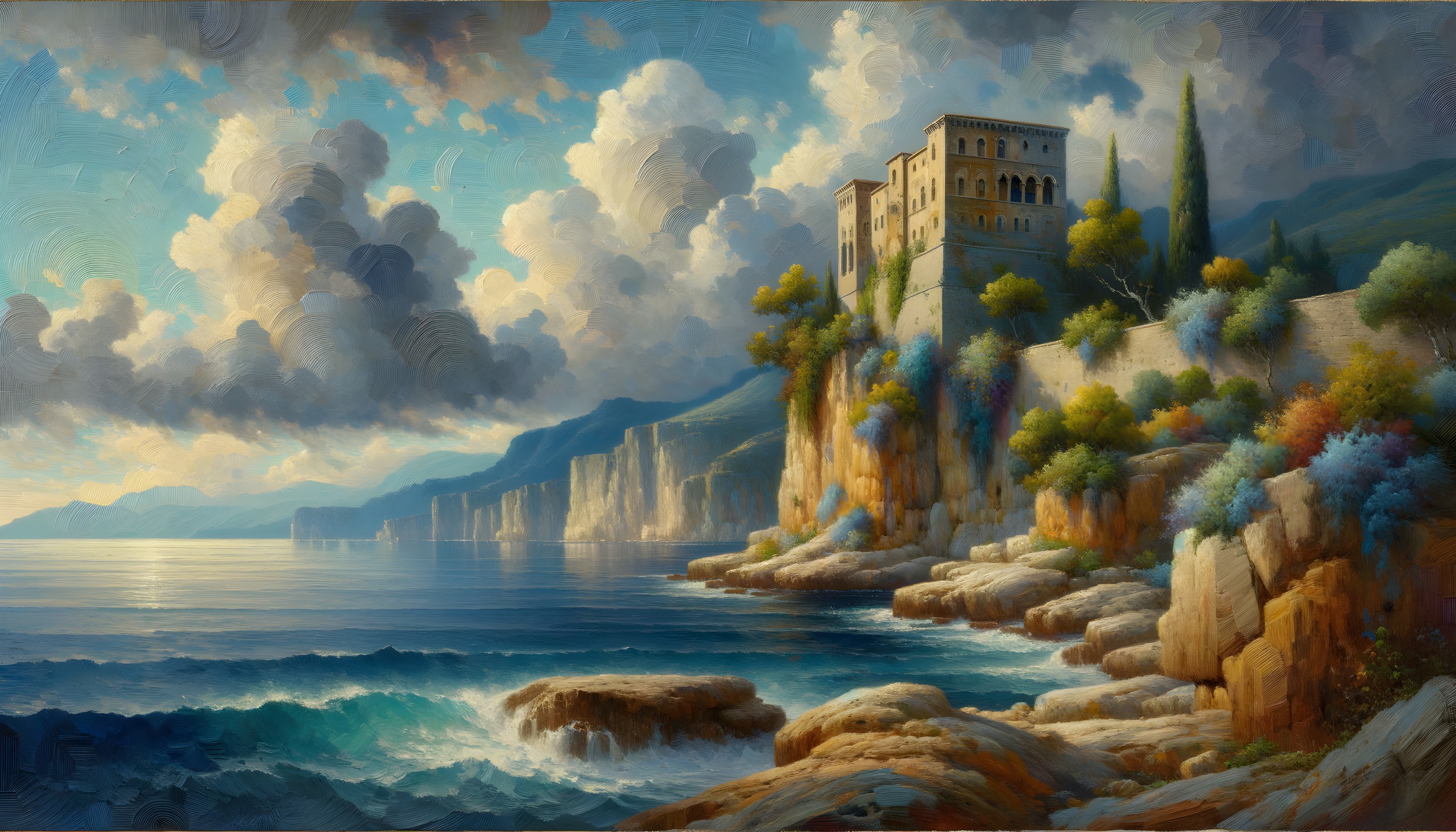 • Prompt: Oil painting of a Mediterranean seaside fortress prominently positioned atop rugged, rocky shores with ochre and sienna boulders and cliffs. Bottom up view, frotress on the right-hand side of the painting. Patches of bright foliage cling to the rocks. Gently lapping at the shore is a calm sea, its surface capturing a reflection of the scene, with broad brushstrokes of cobalt, indigo, and azure hues simulating the movement of water. The fortress has multiple levels, with arched windows and balconies The background shows a tranquil vista of distant rolling hills in muted tones of bluish-grey. The sky above is filled with swirling clouds ind shades of light cerulean blue and white. The painter has rendered the scene in broad strokes to create textural richness.