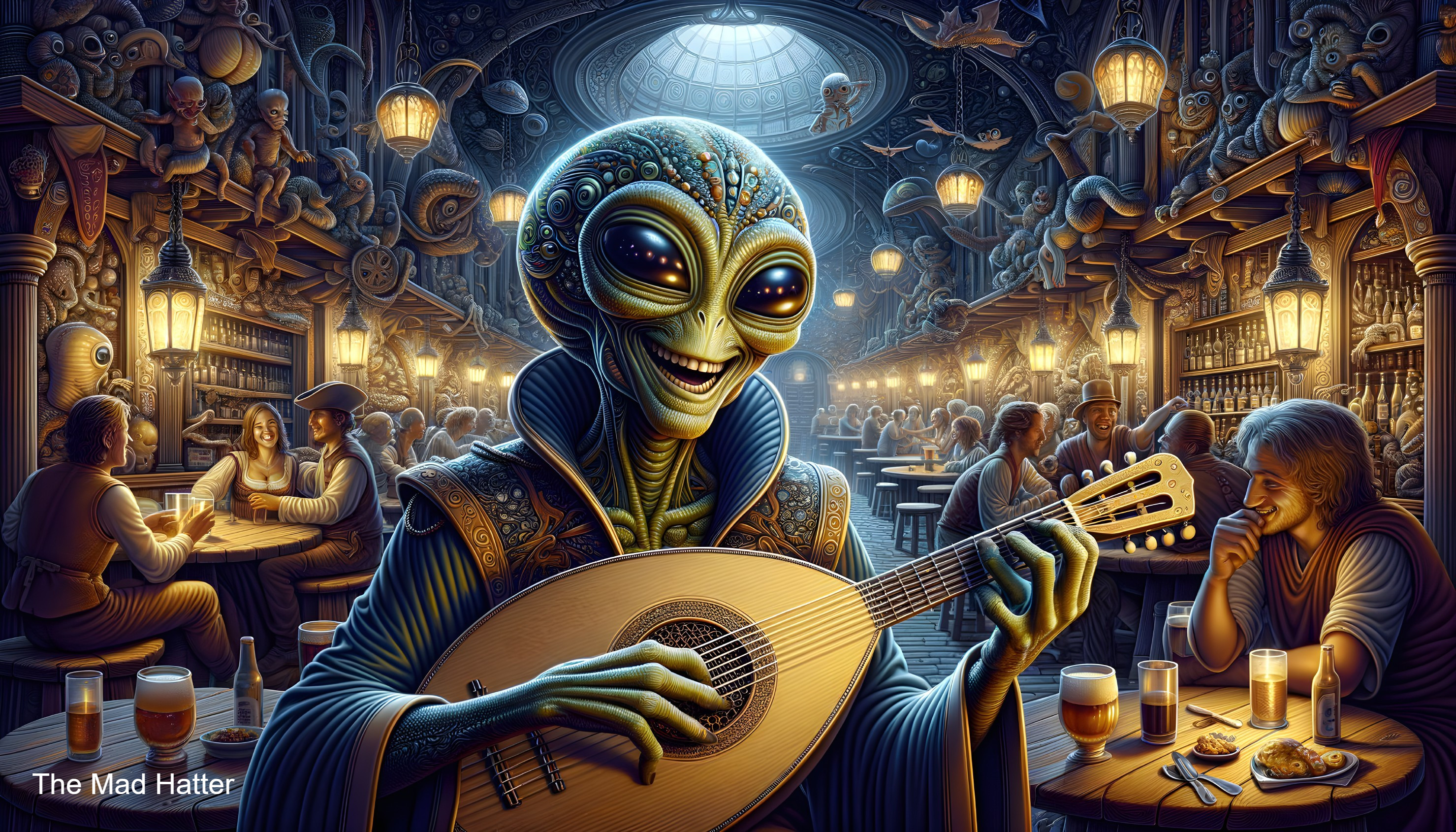 Alien Playing Lute in Lively Tavern Scene