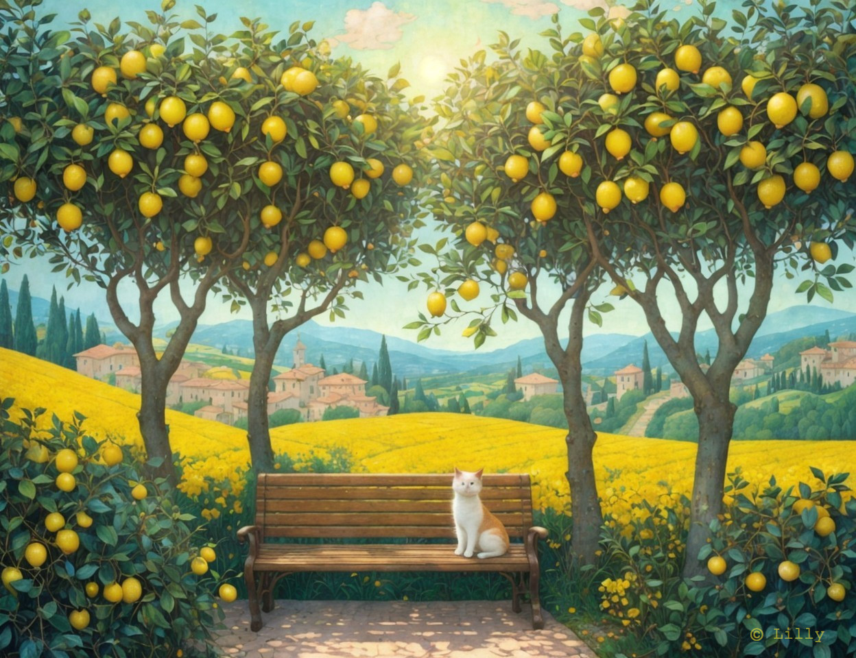 Tranquil countryside scene with lemon trees and cat 79w