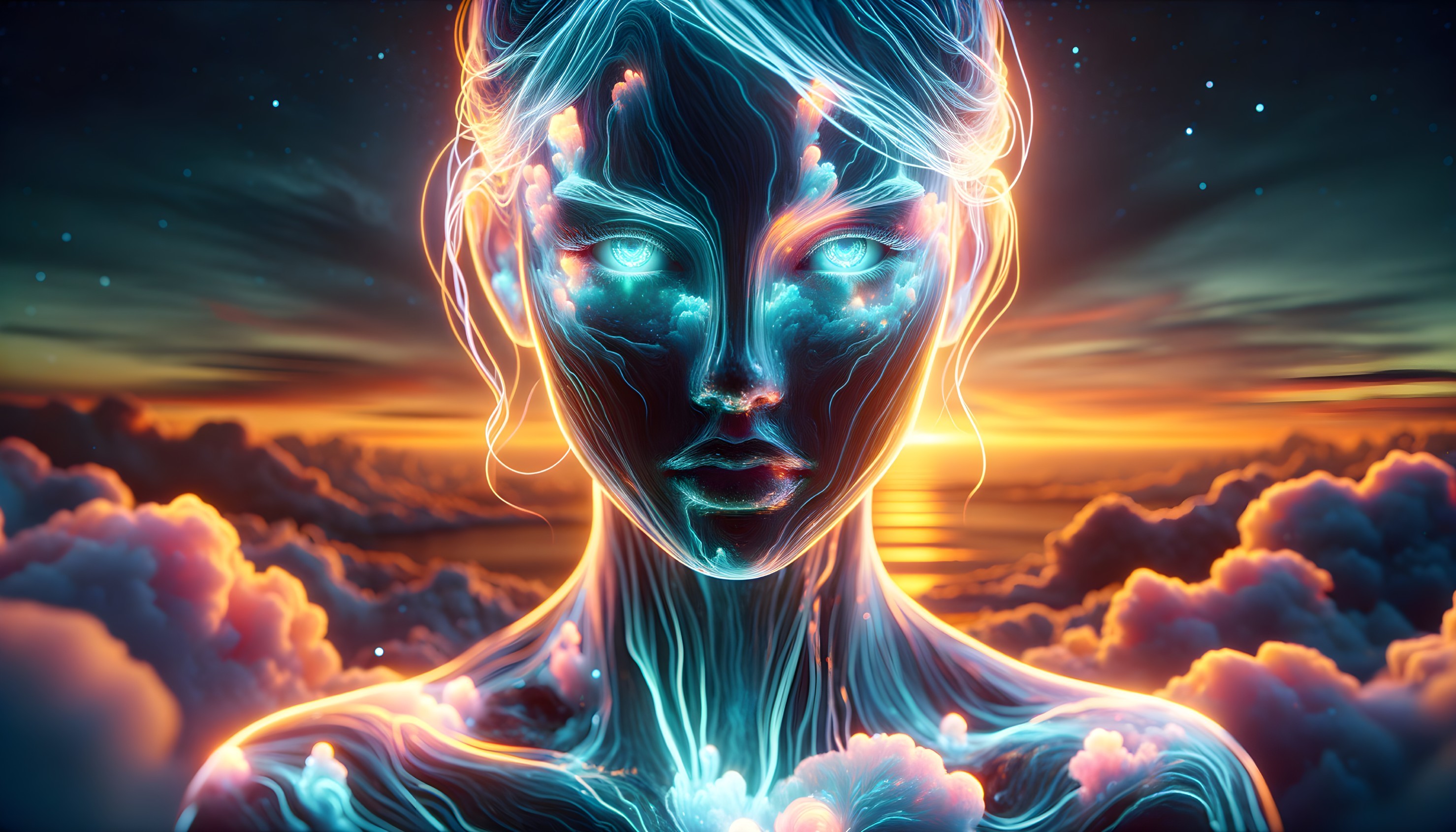• Prompt: close up of a transparent neon girl, silhouetted liquid epoxy, holographic, garland, sculptural face portrait, bioluminescence, light inside body, sunset sky, clouds, double exposure installation, beautiful, gracious, filigree, multilayers, close up, transparent, otherworldly lighting, epic, mystical, close up beautiful Waterhouse face, beautiful eyes, hyperrealism, shadow play, intricate, dynamic pose, unusual beautiful details, masterpiece, amazing lighting, luminis, by Deborah Butterfield, Andy Goldsworthy, Xavier Puente Vilardell,