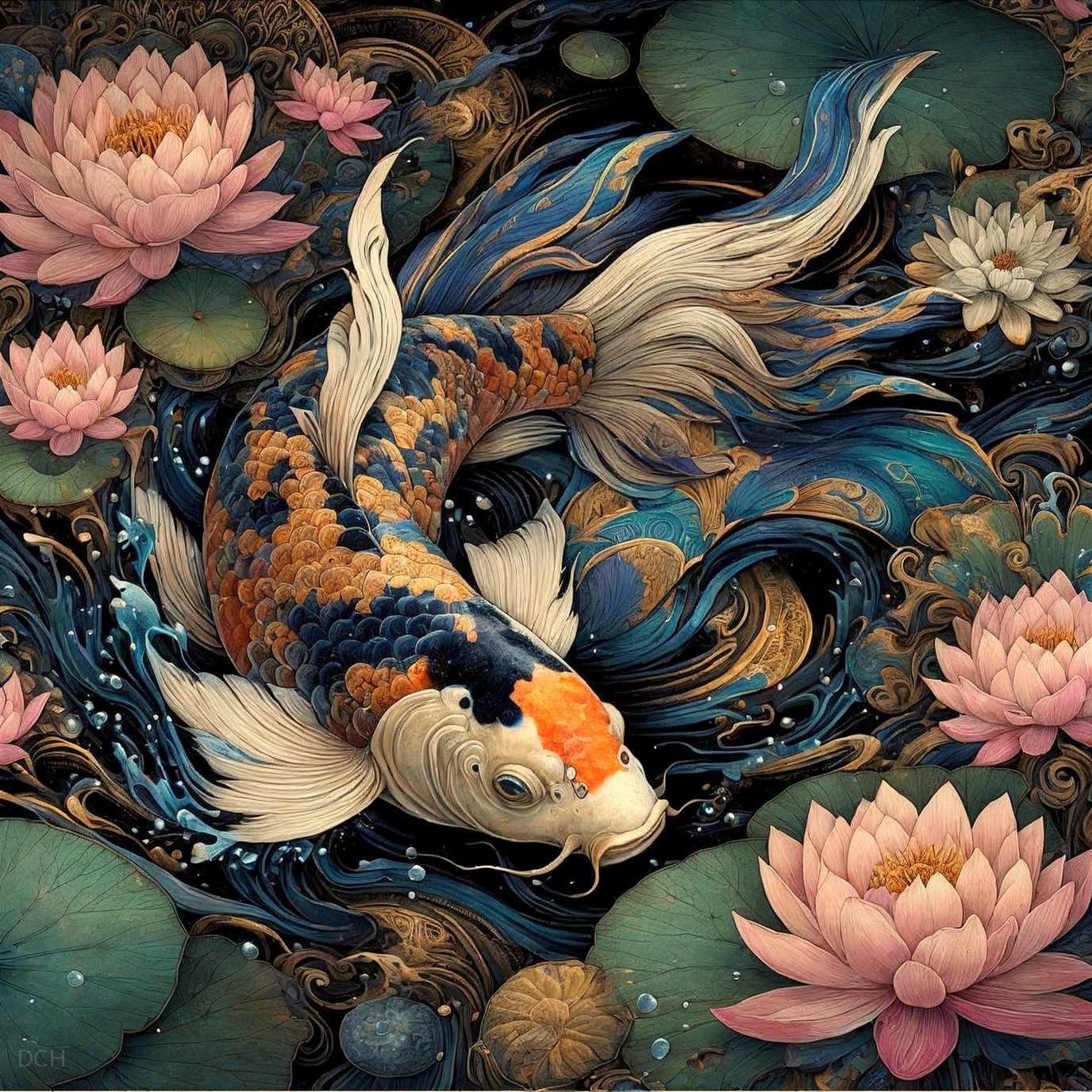 Koi Fish Among Lotus Flowers in Blue Waters Illustration 88w
