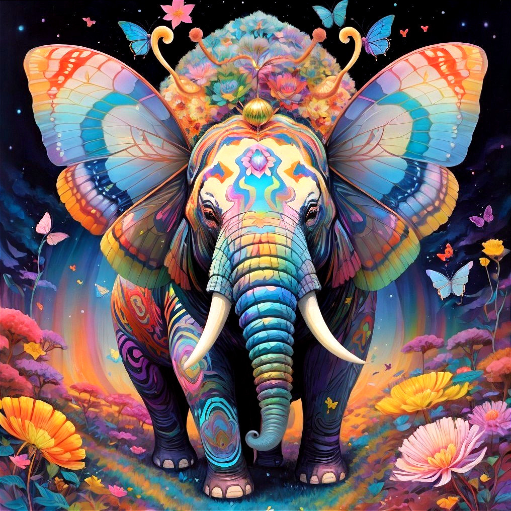 Colorful Elephant with Butterfly Wings in Psychedelic Art 89w