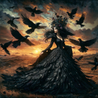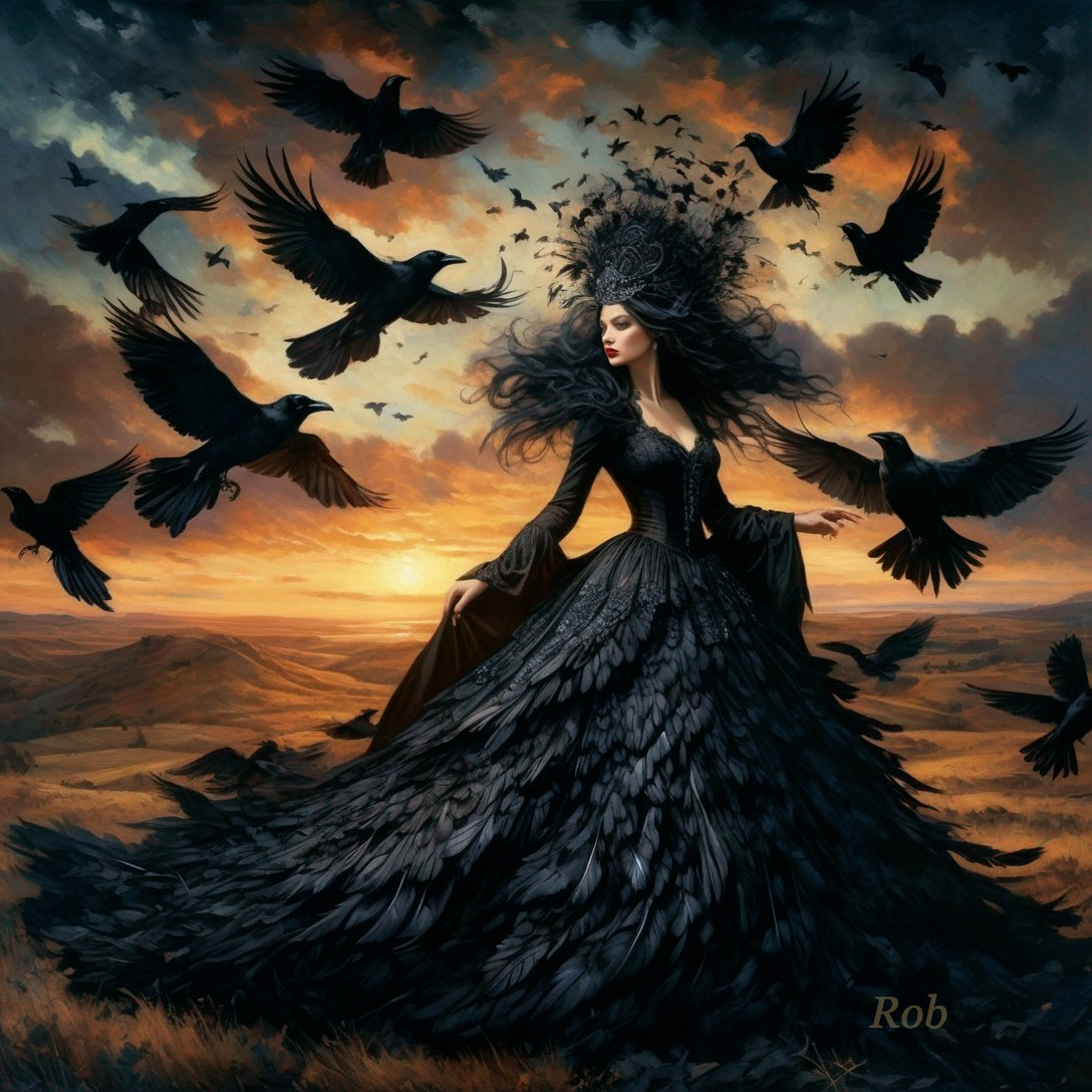 • Prompt: The Raven Queen wearing a dress made of black featherers has a flock of ravens flying around her. The landscape behind her is wild and dramatic. Sunset. Fantasy painting by van Gogh, Alex Gris, Tony Sart, Sherry Akrami, Yossi Kotler, Duy Huynh. Watercolor by Steve Hanks.