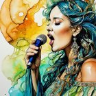 Prompt: The wolf, with its striking features, has a coat that is a mix of gray and orange, and its eyes have an enchanting golden hue. The background is painted in vibrant shades of turquoise and green, creating a serene and enchanting atmosphere that underscores the bond between the girl and the wolf. Both subjects are positioned against this colorful background, emphasizing their connection and the magical atmosphere of the scene.