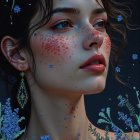 Prompt: portrait of a model with stunning makeup featuring vibrant blue and gold eye designs, adorned with intricate patterns. She wears a cozy knitted hat and a colorful striped sweater, highlighting a mix of warm and cool tones. In her hands, she gently holds a bouquet of bright flowers, including daisies and other colorful blooms, creating a harmonious blend of colors. The background is softly blurred, emphasizing her expressive features and the beauty of the floral arrangement.