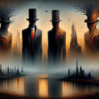 Prompt: Abstract art, oil on canvas.They walk in line through painted skies, With pointed hats and hollow eyes. The ground reflects their silent pace,
