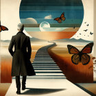 Prompt: A mysterious fashion model with a unique white hairstyle and vintage glasses is depicted in a romantic and whimsical scene. A ladybug accompanies the model. The setting is the early morning mist of the Kalahari desert. The image has a patchwork, nostalgic feel and features impasto textures. It blends the raw, untaught aesthetic of Art Brut with gloomy, desaturated colors. The artistic style combines the primitive simplicity reminiscent of Paul Klee, the intricate line work of Arthur Rackham, the eerie whimsy of Tim Burton, the stencil-like motifs characteristic of Banksy, and the illuminated manuscript inspiration found in the works of Aaron Douglas.