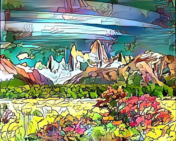 Phantasie, abstract, tone red golden white grey, foreground a flower, background skyline, deco pictu