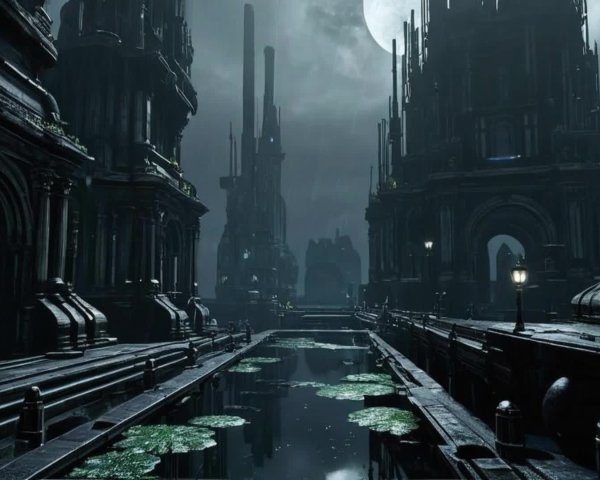 Prompt: A digital painting of a menacing, veiled statue carved from polished black marble. The figure stands in a subterranean, vaulted chamber with ancient, fluted columns. The air is heavy and still. A shallow bowl of viscous red fluid sits at the base of the statue, casting a dark reflection. Focus on texture, grim realism, and a low-light environment.