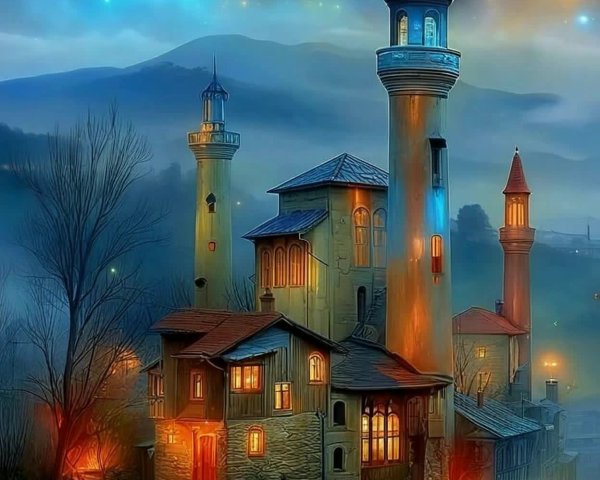 Prompt: In the snowy night, in old village colored houses, intricate oil on canvas crisp quality colourful Fine art America, painted by Alexander Jansson