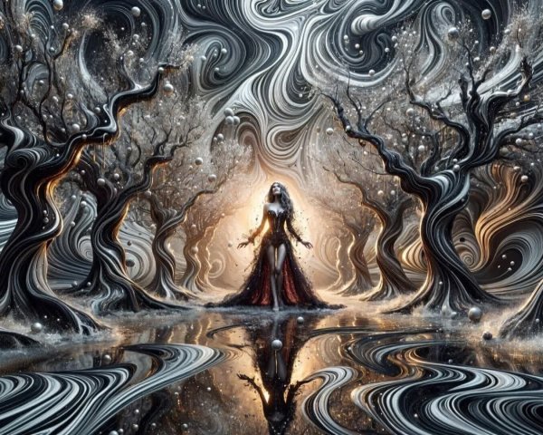 Prompt: Landscape in an ethereal ink painting. A solitary, contemplative figure, a shower of colors. Each drop is a bubble of emotion: red, blue on a melancholic texture, green of hope. The dark ground gradually illuminates with ray tracing effects.
