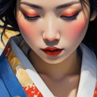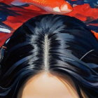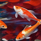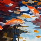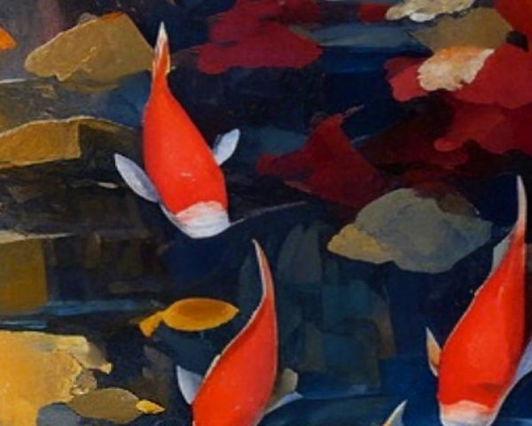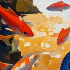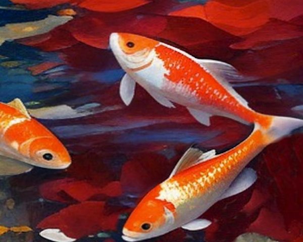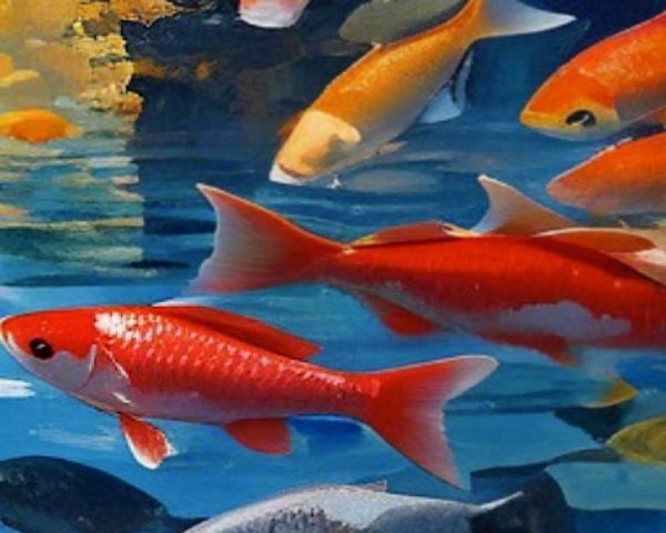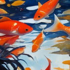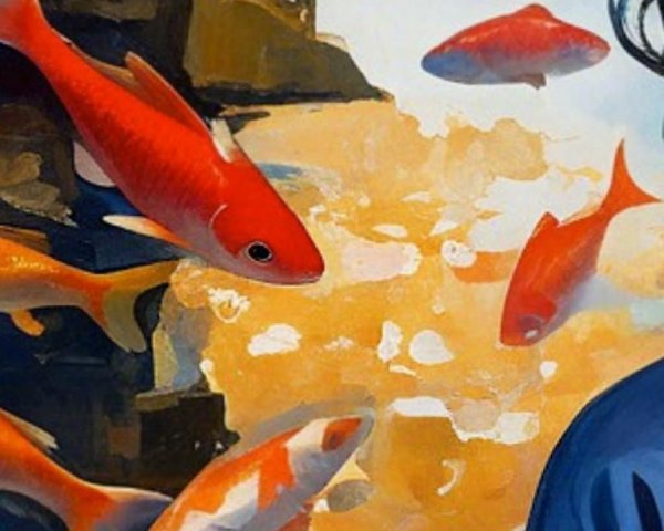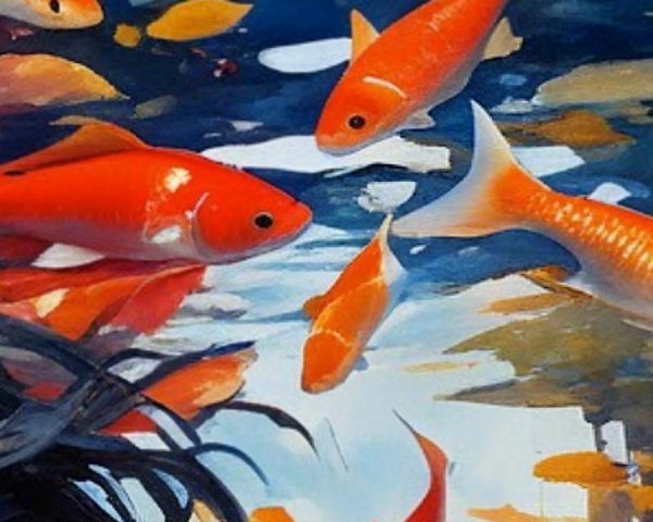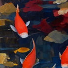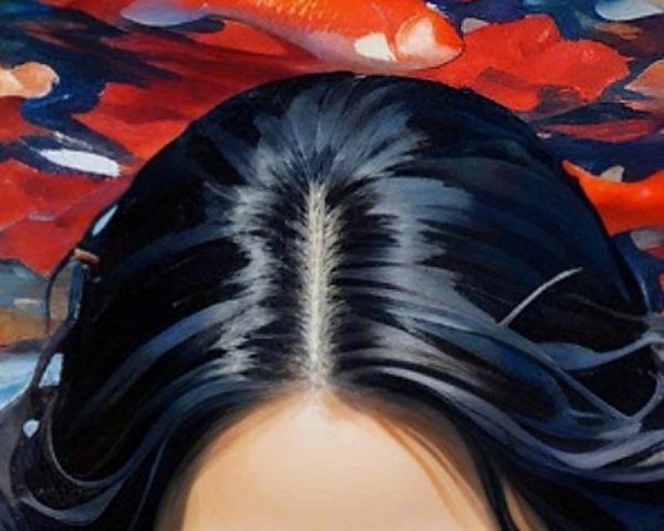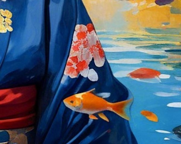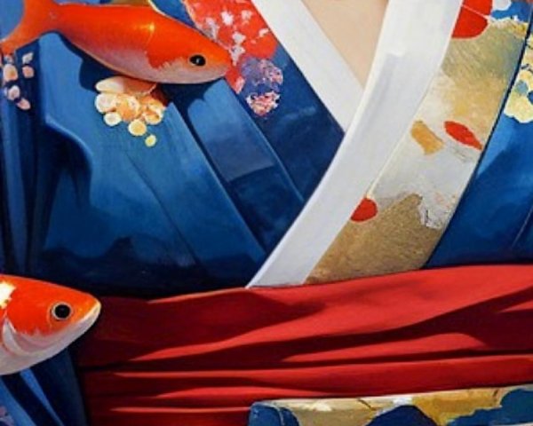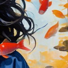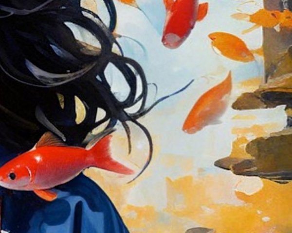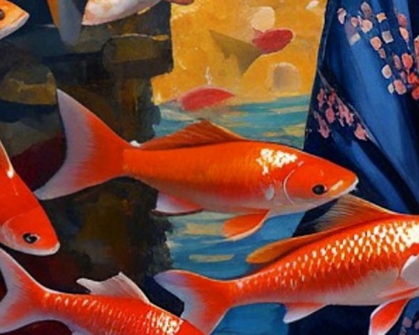 Prompt: Create a semi-abstract Impressionism painting, a dark haired Japanese woman in a red accented kimono submerged in a deep blue pool surrounded by assorted and colorful fish. Her eyes are nearly closed as if she is experiencing a mystical dream. The image features layered textures and fragmented elements using purposeful brushwork to make the Japanese girl emerge gracefully from the tranquil background pattern Half body, stylish dress.