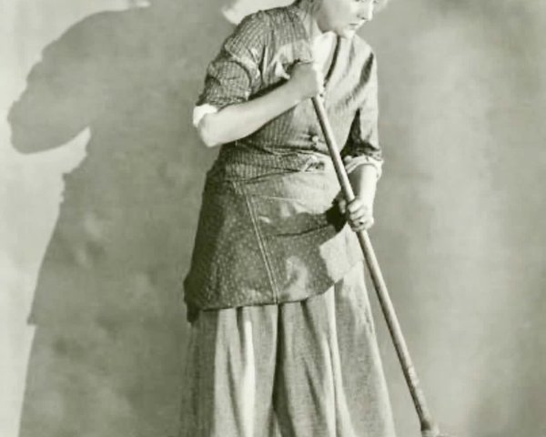 Prompt: The painting depicts a woman with an incredibly expressive face and a large circle on her head that resembles a crown. She stands in the foreground, touching her lips with her fingers, as if in thought or prayer. Around her are several tables with a variety of baked goods—cookies, pies, and fruit.