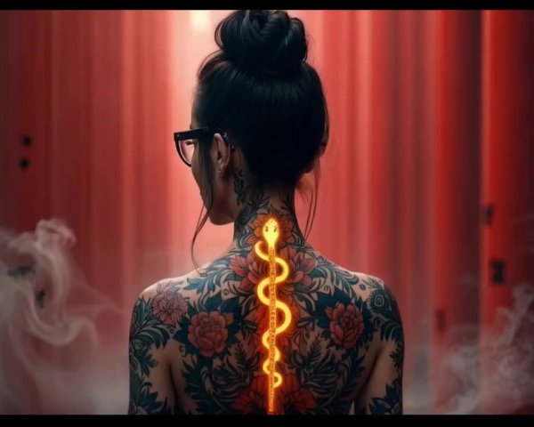 , dimly lit room, the air thick with the scent of incense, wisps of smoke lazily drifting through the air, a single spotlight illuminating the girl's tattooed back, creating an otherworldly ambiance, the room adorned with ornate Asian-inspired decor, red silk curtains cascading down the walls, a sense of mystery and intrigue permeating the surroundings