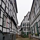 The buildings are crooked and full of personality, with charming timber frames, crooked chimneys, arched windows, and whimsical shop signs dangling from iron brackets. Tiny shopfronts with glowing lanterns, flower boxes bursting with late-blooming blossoms, and curling smoke rising from chimneys give the city a feeling of cozy enchantment.