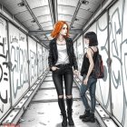 Her young female friend with short black hair, wearing torn bluejeans and a black blouse, and sneakers.