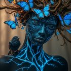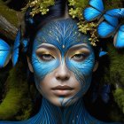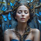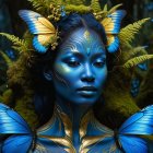 Prompt: Create an artistic scene featuring a half-portrait of a woman with an ethereal and serene expression. The woman has delicate, symmetrical facial features, pale skin, and deep-set, expressive eyes that depict a soft gaze. Her lips are full and subtly shaded. Flowing, voluminous hair cascades around her, rich in deep blue tones, intertwined with intricate golden leaves and abstract patterns reminiscent of waves.