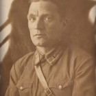 The background is a muted, gradient blend of earthy tones, ranging from soft beige to deeper browns, which adds to the overall subdued and eerie ambiance. The figure's attire is also abstracted,