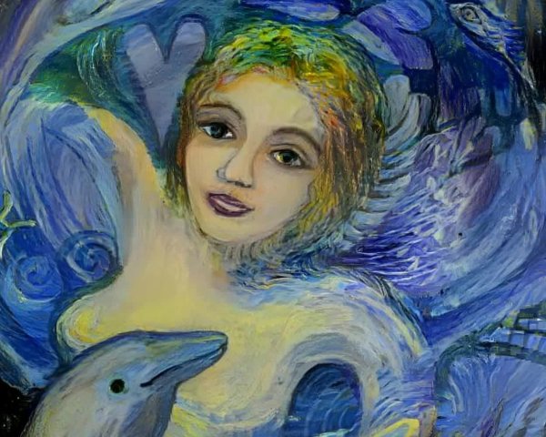 Prompt: Beautiful Mermaid with large dark mesmerizing eyes in a oil textured coral reef. Unusual Fish swimming. She is spellbinding and lighly smiling. Gorgeous. Spakling highlights. She is ultra-realistic. The background is textured and otherworldly. Her hair is like lightning and energetic. There is a gleam in her eyes. worthy of going viral this image is thought provoking. Breathtaking beauty.