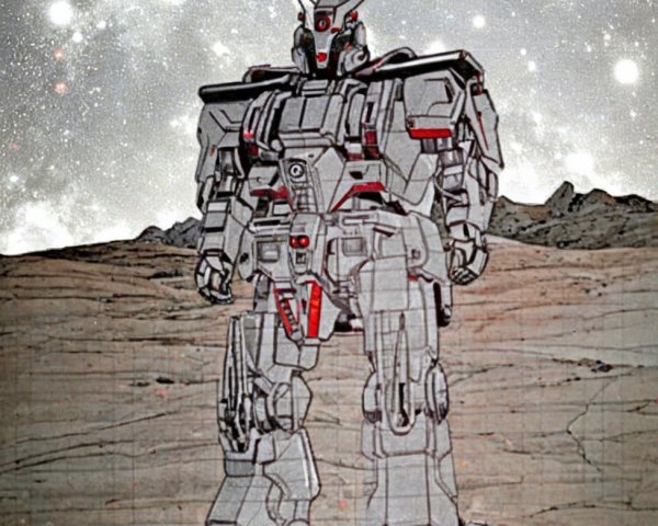 Prompt: A futuristic robot standing on a barren, rocky landscape under a starry night sky. The robot is designed with a mix of angular and rounded shapes, featuring vibrant red accents against a metallic gray body. Its arms are equipped with various tools and gadgets, and it has a sleek helmet with antennae. The background portrays distant mountains and a shimmering star field, creating a dramatic sci-fi atmosphere.