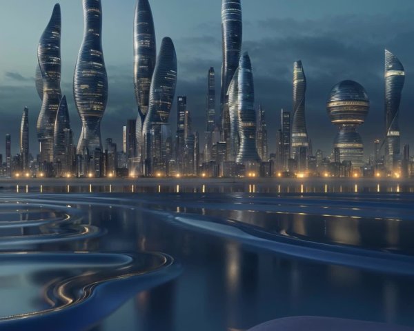 Prompt: Futuristic cyberpunk parametric Cityscape: Nature Meets Technology A futuristic cityscape features sleek, glass skyscrapers intertwined with green terraces and elevated walkways, all under a bright blue sky dotted with fluffy clouds, blending nature and futuristic technologies