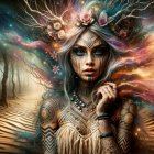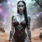 Prompt: In an ethereal blend of surrealism and enchantment, a cosmic color palette swirls around an Amazon warrior in an enchanted forest, adorned with intricate tattoos and tribal patterns that exude spiritual symbolism. The artwork, reminiscent of Dan Quintana's style, features a gothic allure and dramatic lighting that create a shamanic portrait with ultra-realistic details and mesmerizingly large eyes. An albino figure stands out amidst this surreal scene, with water drop ink effects cascading down a chevron-patterned dress, showcasing Artstation-worthy textures. Inspired by vintage surrealism and African artists like Yinka Shonibare, the piece captures a post-apocalyptic desert landscape tinged with cyberpunk elements, blending HDR 8k/4k resolution with nostalgic light leaks and mysterious creatures lurking in swirling sands.