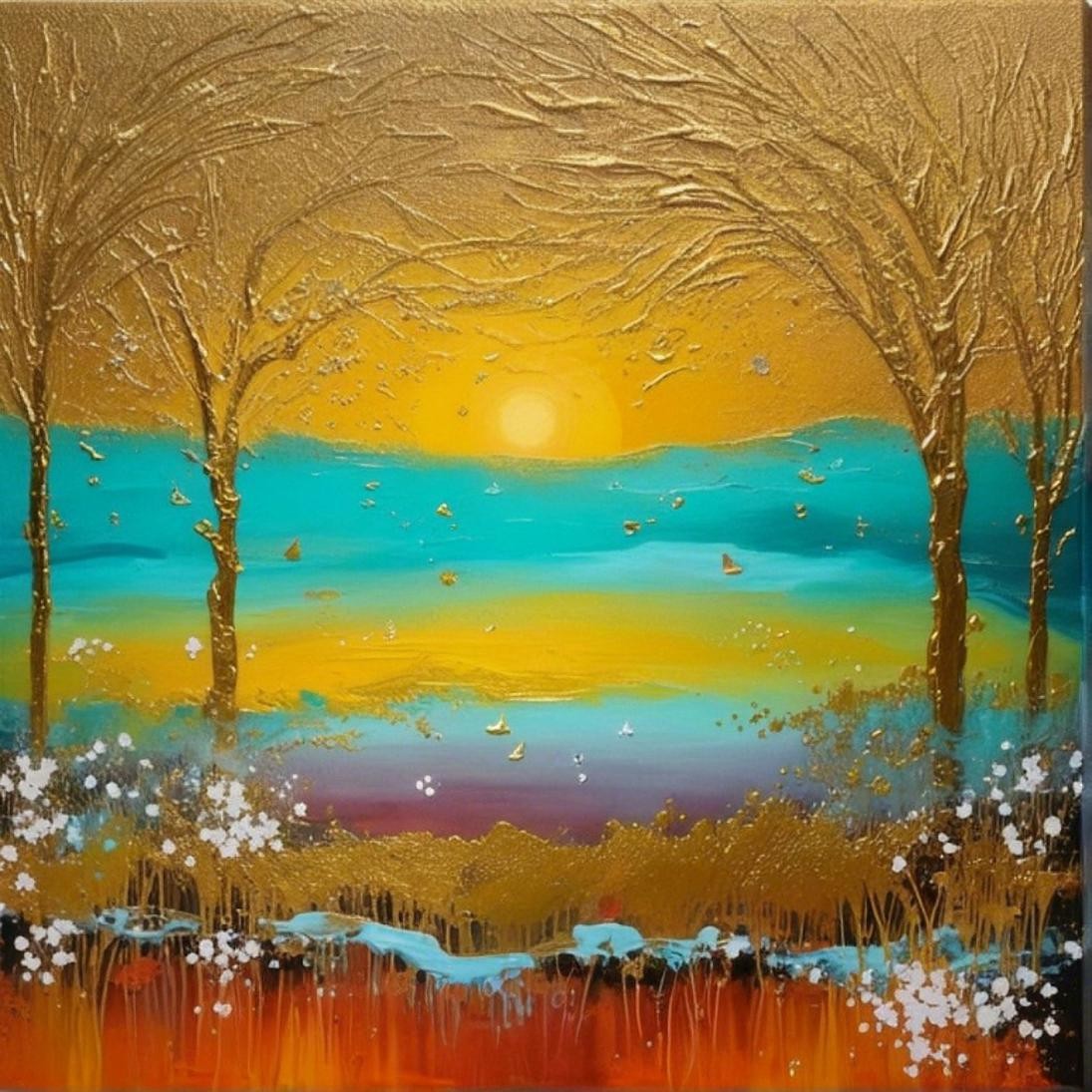 Prompt: Oil on canvas, textured brush strokes, inspired by John Atkinson Grimshaw, Alexander Jansson and Van Gogh, dreamy, captivating reflections, enchanted. Picturesque landscape. Sunset over a mountain lake with sailboats, golden yellow sunset, vibrant, ethereal, dynamic movement, pines.