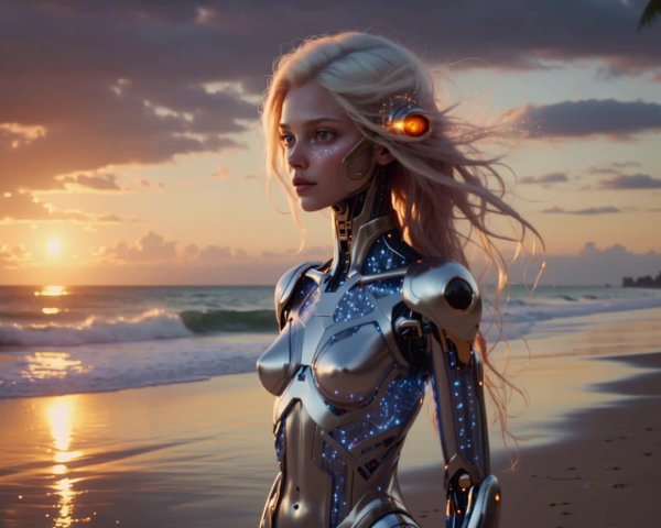 Prompt: On a tranquil beach at sunset, a beautiful girl with long, flowing red hair stands barefoot by the ocean’s edge. The golden light reflects in her eyes and dances along her silken, wind-tossed hair. Across her bare back, a majestic phoenix tattoo glows faintly — its fiery wings spreading from her shoulders as if about to take flight. The waves shimmer with hints of crimson and gold, mirroring the tattoo’s ember tones. Fine grains of sand cling to her skin, and the horizon burns with the colors of rebirth and freedom. The mood is ethereal, serene, and powerful — a moment suspended between fire and sea.