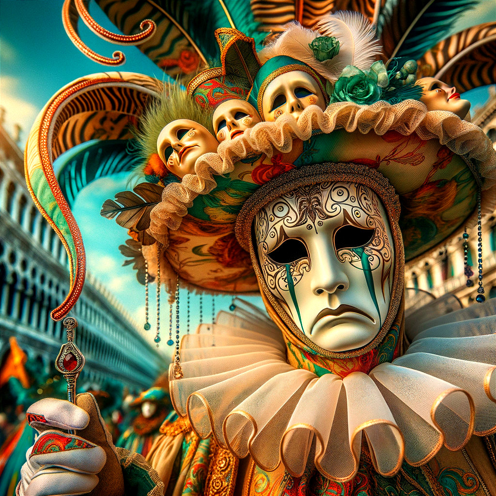 • Prompt: a gentleman wearing a mask of "Anonimous" (with gold filigree) at the Mardi Gras Carnival" - ultra high quality, sharp focus, focused, high focus, very sharp, high definition, extremely detailed, intricate, very attractive, fantasy, surreal style, colorful, fantastic view
