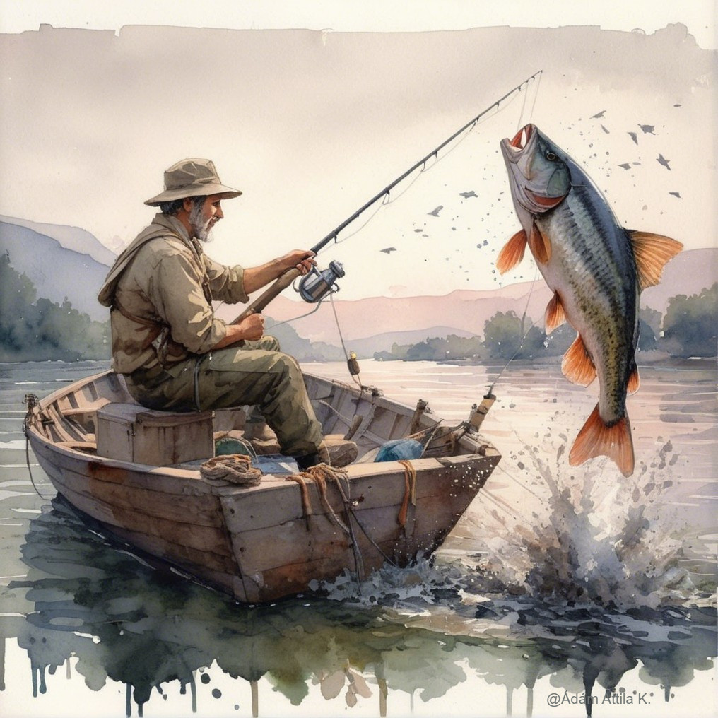 • Prompt: Additional prompt: Please create a sketch of the following scene, using splatter paint and watercolor: A Danube fisherman fishing from his boat catches a large fish in the Danube. In the background, the outlines of the riverbank and distant mountains are visible...