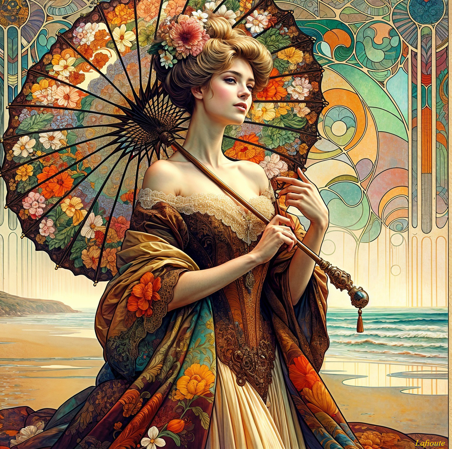 • Prompt: Art nouveau woman, mid-20s, light complexion, holding a decorative parasol with floral embellishments. Elegant, flowing, multi-colored, ornate dress with detailed patterns, displaying a mix of vibrant hues, including browns, oranges, yellows, reds, greens and blues. The dress style is Art Nouveau, with a flowing, textured effect. Woman has a serene, contemplative expression. Full-length view, slightly angled perspective, focused on the woman’s elegant posture. Detailed patterned background depicting a coastal scene with a sandy beach, ocean waves, and a vibrant sky filled with stained-glass-like patterns. Rich color palette. Detailed, intricate design, decorative style, stained glass, Art Nouveau style. Soft, diffused lighting. Seascape setting, rich in color and detailed patterns. Relaxed atmosphere, inviting mood. The parasol and the dress share a cohesive floral pattern. The colors blend seamlessly, creating a harmonious and pleasing aesthetic.