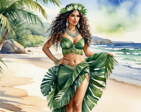 Prompt: Masterpiece, a delicate ink and watercolor wash rendering on rough handmade paper. An enchanting and serene scene unfolds in a graceful, screen-filling composition. A serene woman with cascading wavy chestnut hair, adorned with a single, intricately detailed flower, sits gracefully upon a smooth rock by a tranquil seascape. Her expression is one of peaceful contemplation, her connection to the landscape rendered through ultra-detailed fine ink lines that capture the softness of her features and the faraway look in her eyes. She is dressed in a flowing, golden gown that mirrors the warmth of the setting sun. The fabric is suggested not by solid color, but by layered, luminous washes of ochre, amber, and sienna, with delicate ink strokes defining its folds as it drapes around her, capturing the light like liquid metal. The background is dominated by a large, radiant sun lowering in the sky, a sublime circle of pale gold and peach wash bleeding softly into the paper. This celestial body casts a warm, atmospheric glow over lush, green hills and rugged rocky cliffs, evoked through rhythmic patterns of ink and muted washes of olive and slate. Gentle, lapping waves are implied by horizontal, calligraphic ink strokes and subtle gradations of pale cerulean and grey at the shore. The mood is profoundly peaceful and dreamlike, a harmonious blend of naturalistic observation and poetic artistry. The intricate details of the woman's form and clothing are balanced by the soft, evocative rendering of the landscape, creating a profound sense of unity between the figure and the natural beauty that envelops her.