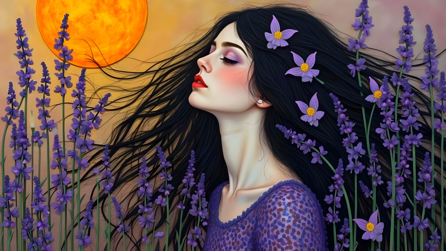 Prompt: Languishing in Lavendar, beautiful realistic woman with correct human anatomy, full red lips, lying on a huge petal that is part of a mammoth-sized flower, flower and petals are exquisitely detailed, sinewy Georgia O'keeffe- life like, the woman has a 1920s vibe, full body shot, in the styles of Angela Betta Casale &