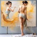 Prompt: A ballerina in a white dress gracefully glides along a spiral staircase, surrounded by flowing white fabric that contrasts with the industrial concrete and red accents of the railings. The overhead view highlights the curves of the staircase and the dancer's elegant pose against a dramatic, oppressive backdrop. A masterpiece of photographic craftsmanship, it conveys an atmosphere of decadence and ambiance. The overall composition emphasizes movement, grace, and vibrant color against a muted background. Atmospheric, multi-layered watercolor.